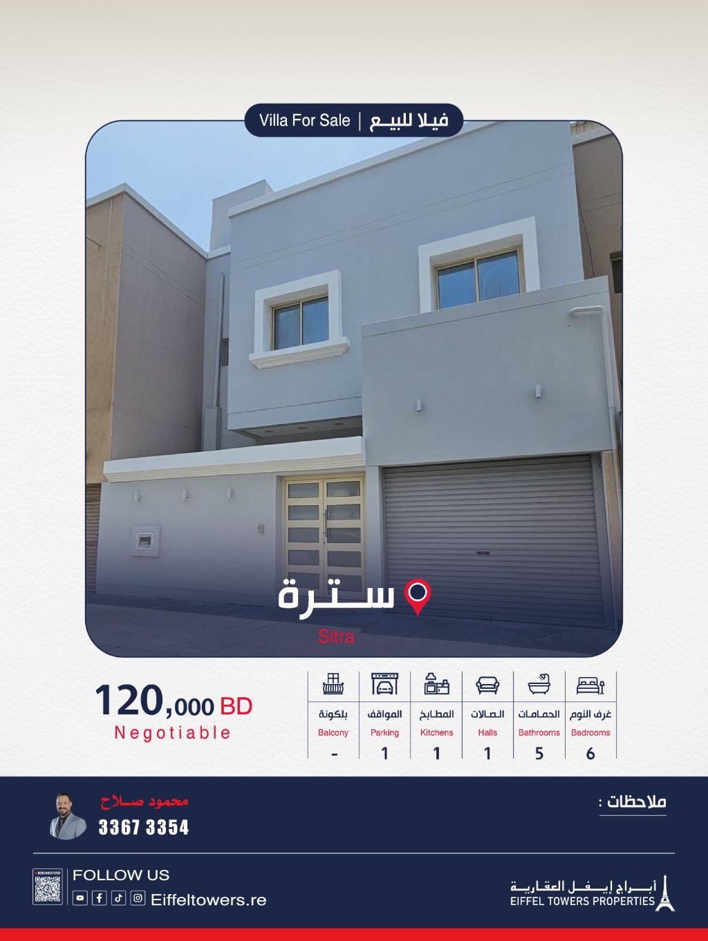 شركة أبراج أيفل العقارية تعرض فيلا للبيع في سترة. مساحة الأرض: 163 متر مربع. مساحة البناء: 230 متر مربع. تفاصيل الفيلا: 6 غرف نوم، 1 صالة، 1 مطبخ، 5 دورات مياه، 1 موقف سيارات. شارعين أمامي وخلفي. بالقرب من جميع الخدمات. السعر الإجمالي: 120,000 دينار بحريني. للتواصل: محمود صلاح. شركة أبراج أيفل العقارية وسيط معتمد من قبل مؤسسة التنظيم العقاري، رقم الترخيص B202403/1257.