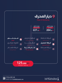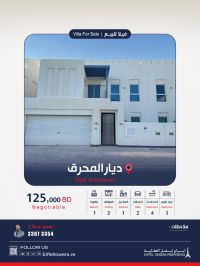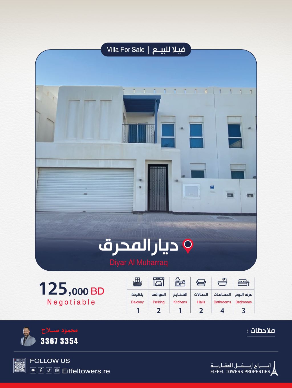 شركة أبراج أيفل العقارية تعرض فيلا للبيع في ديار المحرق (ديرة العيون). مساحة الأرض: 204 متر مربع. مساحة البناء: 227 متر مربع. تفاصيل الفيلا: 3 غرف نوم، 2 صالات، 1 مطبخ، 4 دورات مياه، 2 موقف سيارات، حديقة خلفية، غرفة غسيل، مجلس. قريبة من جميع الخدمات. السعر الإجمالي: 125,000 دينار بحريني. للتواصل: محمود صلاح، eiffeltowers.re، eiffeltowers.re. وسيط معتمد من قبل مؤسسة التنظيم العقاري، رقم الترخيص B202403/1257.