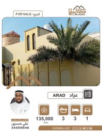 فيلا واسعة للبيع في عراد بمساحة 345 متر مربع بسعر 135,000 دينار بحريني. تقع الفيلا في منطقة راقية وهادئة في عراد، قريبة من جميع الخدمات مثل المحلات التجارية، السوبر ماركت، المطاعم، وغيرها. مواصفات الفيلا: 3 غرف نوم، صالة واسعة، 3 حمامات، مطبخ، غرفة غسيل، غرفة خادمة، موقف سيارة، حوش خلفي. مساحة الأرض: 345 متر مربع. سعر البيع: 135,000 دينار بحريني فقط، قابل للتفاوض. للاستفسار والتواصل.