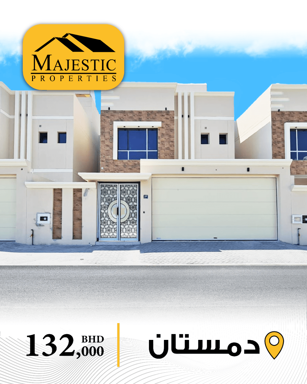 للبيع بيت جديد في دمستان يتكون من 4 غرف نوم، صالتين، مجلس، مطبخين، 6 حمامات، غرفة خادمة، غرفة غسيل، حديقة، كراج لسيارتين. مساحة الأرض: 223.5 متر مربع. مساحة البناء: 320 متر مربع. السعر المطلوب: 132 ألف دينار بحريني. المرجع: MPM3390.