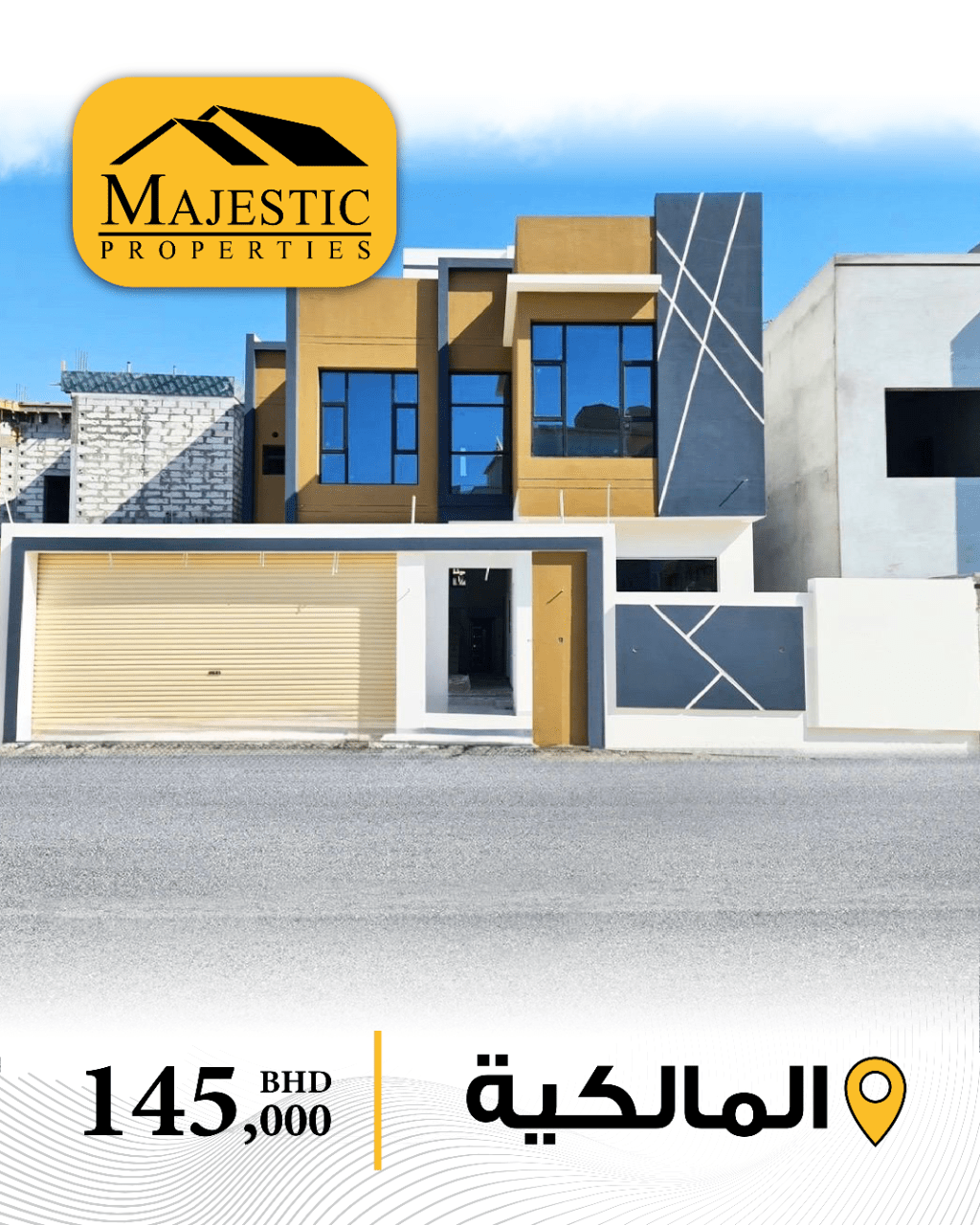للبيع فيلا جديدة في المالكية تتكون من 5 غرف نوم، صالة، مجلس، مطبخ، 5 حمامات، غرفة غسيل، كراج لسيارتين، مساحة الأرض 251 متر مربع، مساحة البناء 296 متر مربع. السعر المطلوب 145 ألف دينار بحريني. الرقم المرجعي HS199.