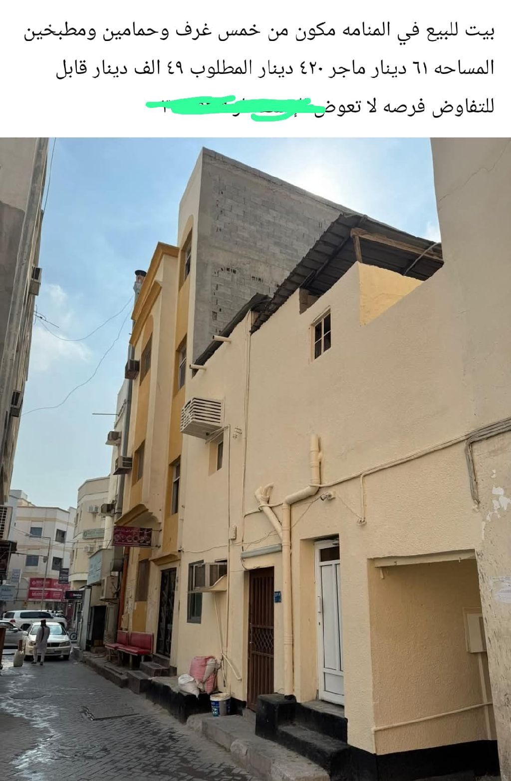 بيت للبيع في المنامة، مكون من خمس غرف وحمامين ومطبخين. المساحة 61 متر مربع. مؤجر حالياً بـ 420 دينار. السعر المطلوب 49,000 دينار (قابل للتفاوض). فرصة لا تعوض لأصحاب التميز الاستثماري.