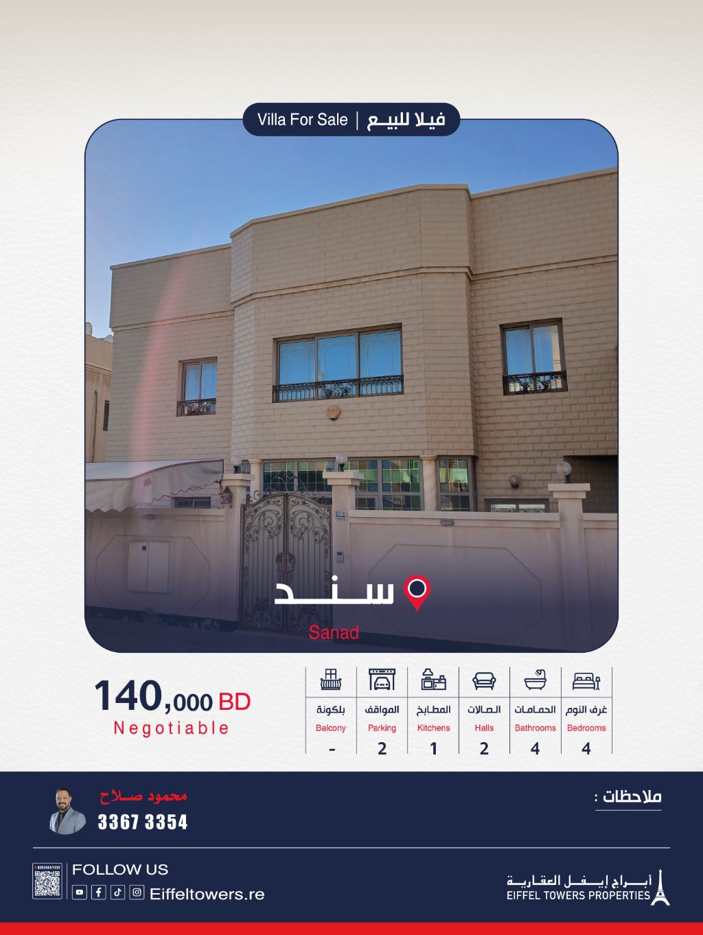 شركة أبراج أيفل العقارية تقدم فيلا للبيع في سند. مساحة الأرض: 302 متر مربع. تفاصيل الفيلا: طابقين، 5 غرف، صالتين، مطبخ واحد، كراجين، 5 دورات مياه. مميزات إضافية: مجلس، مخزن خارجي. بالقرب من جميع الخدمات. السعر الإجمالي: 140,000 دينار بحريني. للتواصل: محمود صلاح، eiffeltowers.re، eiffeltowers.re. وسيط معتمد من قبل مؤسسة التنظيم العقاري، رقم الترخيص B202403/1257.
