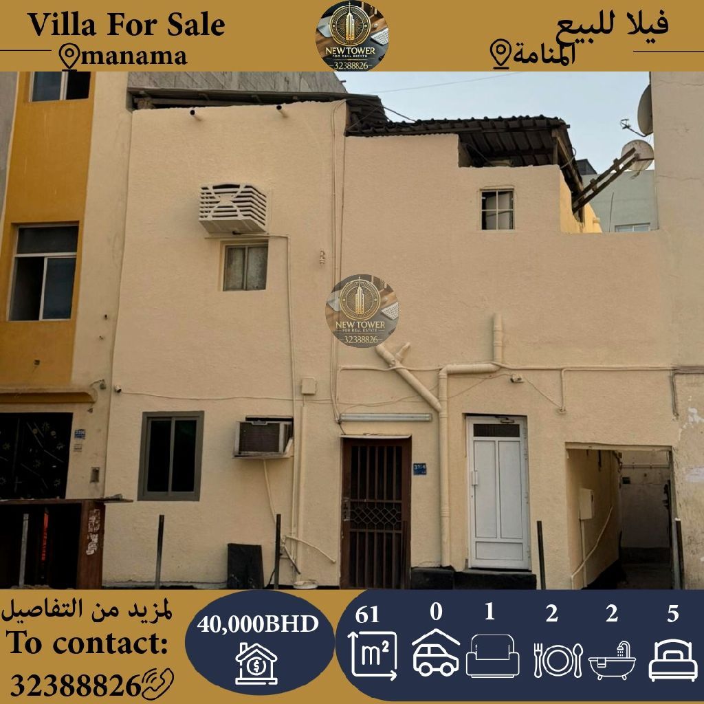 للبيع: بيت في المنامة بموقع مميز وفرصة استثمارية. يحتوي على 5 غرف نوم، 2 مطبخ، 2 حمام، مساحة الأرض 61 متر مربع، الدخل الشهري الحالي 419 دينار بحريني، والسعر المطلوب 40,000 دينار بحريني (قابل للتفاوض). للتواصل: البرج الجديد للعقارات.