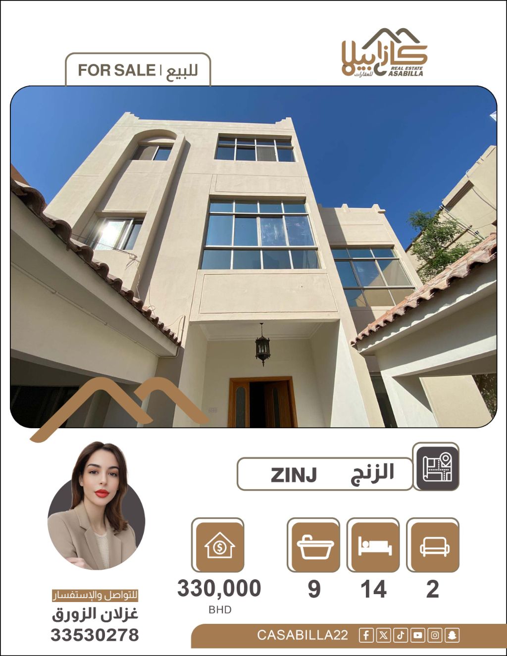فيلا للبيع في منطقة الزنج. فرصة تملك عقاري ضخم بمزايا استثمارية في قلب "الزنج". استثمر في عقار يمنحك القوة والمساحة: فيلا عملاقة بتصميم يتيح لك خيارات متعددة، سواء للسكن العائلي الفاخر أو كأصل استثماري ذو عائد مرتفع في أكثر مناطق العاصمة حيوية. 14 غرفة، 2 مطبخ، صالة، 9 حمام، غير مفروش. مساحة البناء: 240 متر مربع، مساحة الأرض: 330.4 متر مربع، 6 مواقف. السعر: 330 ألف دينار. للتواصل.