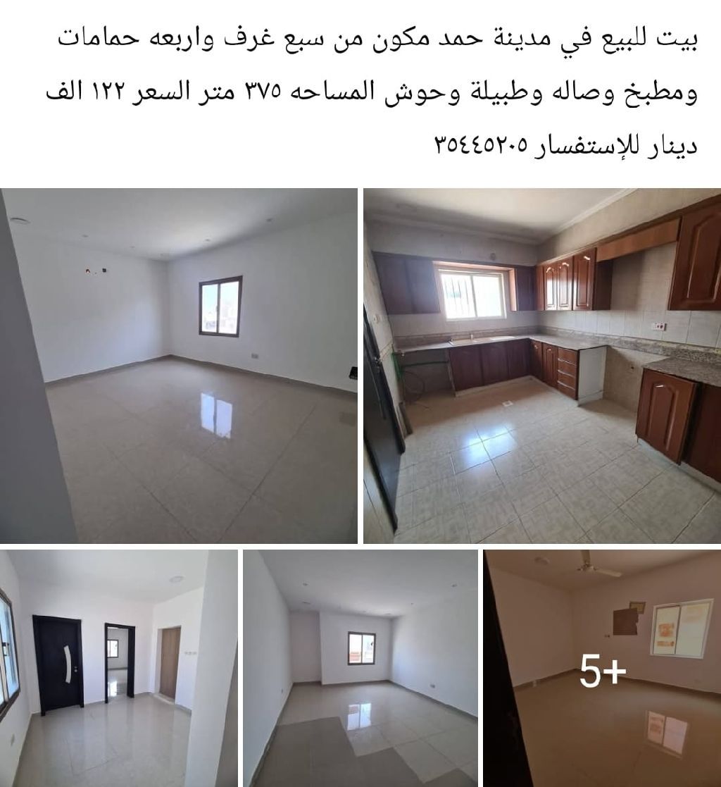 بيت للبيع في مدينة حمد، يتكون من سبع غرف وأربعة حمامات ومطبخ وصالة ومجلس وحوش. المساحة 375 متر مربع. السعر 122 ألف دينار