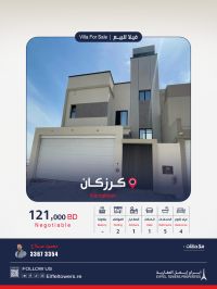 شركة أبراج أيفل العقارية للبيع: بيت في كرزكان بمساحة أرض 171 متر مربع ومساحة بناء 270 متر مربع. تفاصيل الفيلا: طابقين، 4 غرف نوم، صالة واحدة، مطبخ واحد، 5 دورات مياه، وموقفين. مميزات إضافية: غرفة طعام وغرفة غسيل، بالقرب من جميع الخدمات. السعر الإجمالي: 121,000 دينار بحريني. للتواصل: محمود صلاح، eiffeltowers.re، eiffeltowers.re، وسيط معتمد من قبل مؤسسة التنظيم العقاري برقم الترخيص B202403/1257.