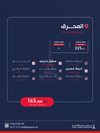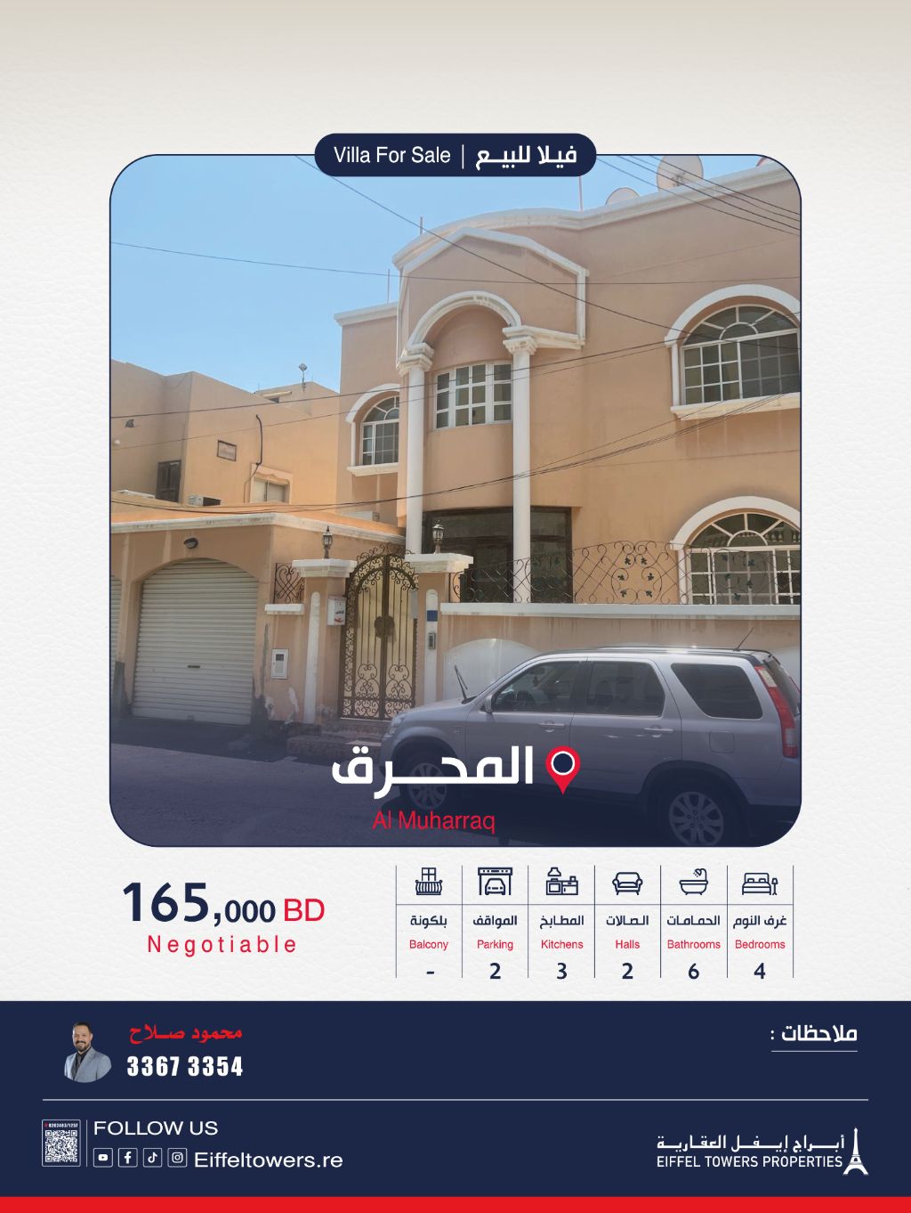 شركة أبراج أيفل العقارية تقدم فيلا جديدة للبيع في المحرق. مساحة الأرض 335 متر مربع. تفاصيل الفيلا: طابقين، 4 غرف نوم، 2 صالات، 3 مطابخ، 6 دورات مياه، و2 موقف سيارات. مميزات إضافية: منطقة غسيل، على شارعين، وقريبة من جميع الخدمات. السعر الإجمالي: 165,000 دينار بحريني. للتواصل: محمود صلاح، eiffeltowers-re، eiffeltowers.re، وسيط معتمد من قبل مؤسسة التنظيم العقاري، رقم الترخيص B202403/1257.