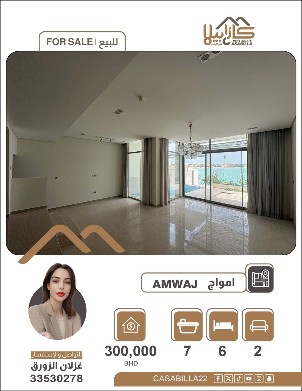 فيلا للبيع في منطقة أمواج على البحر. فيلا فاخرة للبيع مباشرة على البحر في جزر أمواج. استمتع بقمة الرفاهية والخصوصية بتملك فيلا الأحلام في أرقى الوجهات البحرية في البحرين. تتميز الفيلا بموقع استراتيجي مباشر على الواجهة البحرية، مع تصميم معماري فريد يوفر مساحات واسعة وخدمات متكاملة تناسب العائلات الكبيرة الباحثة عن التميز. 6 غرف + غرفة عاملة منزلية + ستور + غرفة غسيل، 3 مطابخ، 2 صالات، 7 حمامات، 3 بلكونه.