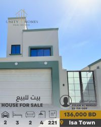للبيع: فيلا جديدة وعصرية في مدينة عيسى. تقع على شارع وممر. موقع ممتاز. جميع الخدمات متوفرة. المساحة 221 متر مربع. مساحة البناء 270 متر مربع. 3 غرف نوم. 4 حمامات. صالتين. مطبخ. غرفة خادمة. موقف لسيارتين. سعر البيع 136 ألف دينار بحريني.