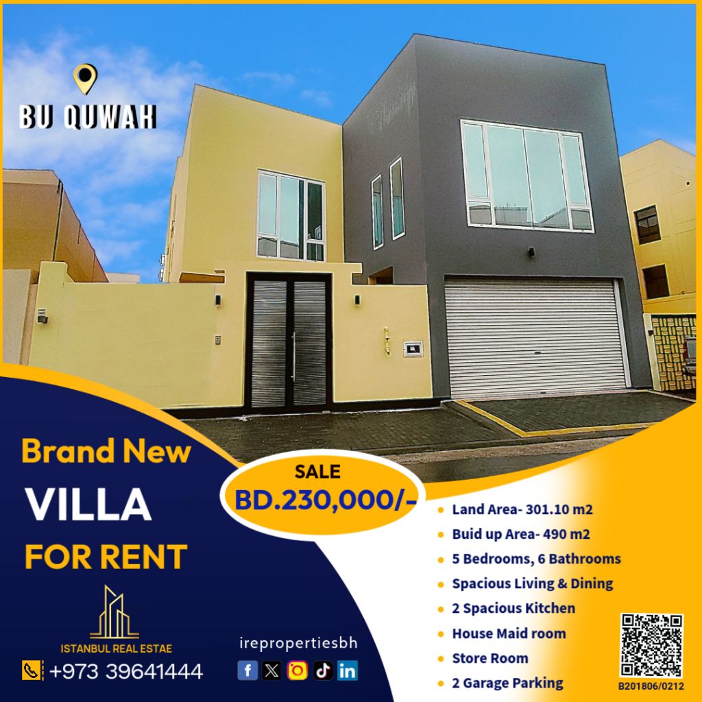 A new luxury villa for sale in Bu Quwah - 230000 Bahraini dinars. Location Bu Quwah. Land area 301.10 SQM. Built - up area approximately 490 SQM. Villa specifications 5 bedrooms - 6 bathrooms - spacious living and dining area - two large kitchens - maid's room with private bathroom - laundry room + storage room - garage that accommodates two cars. Design and supervision The