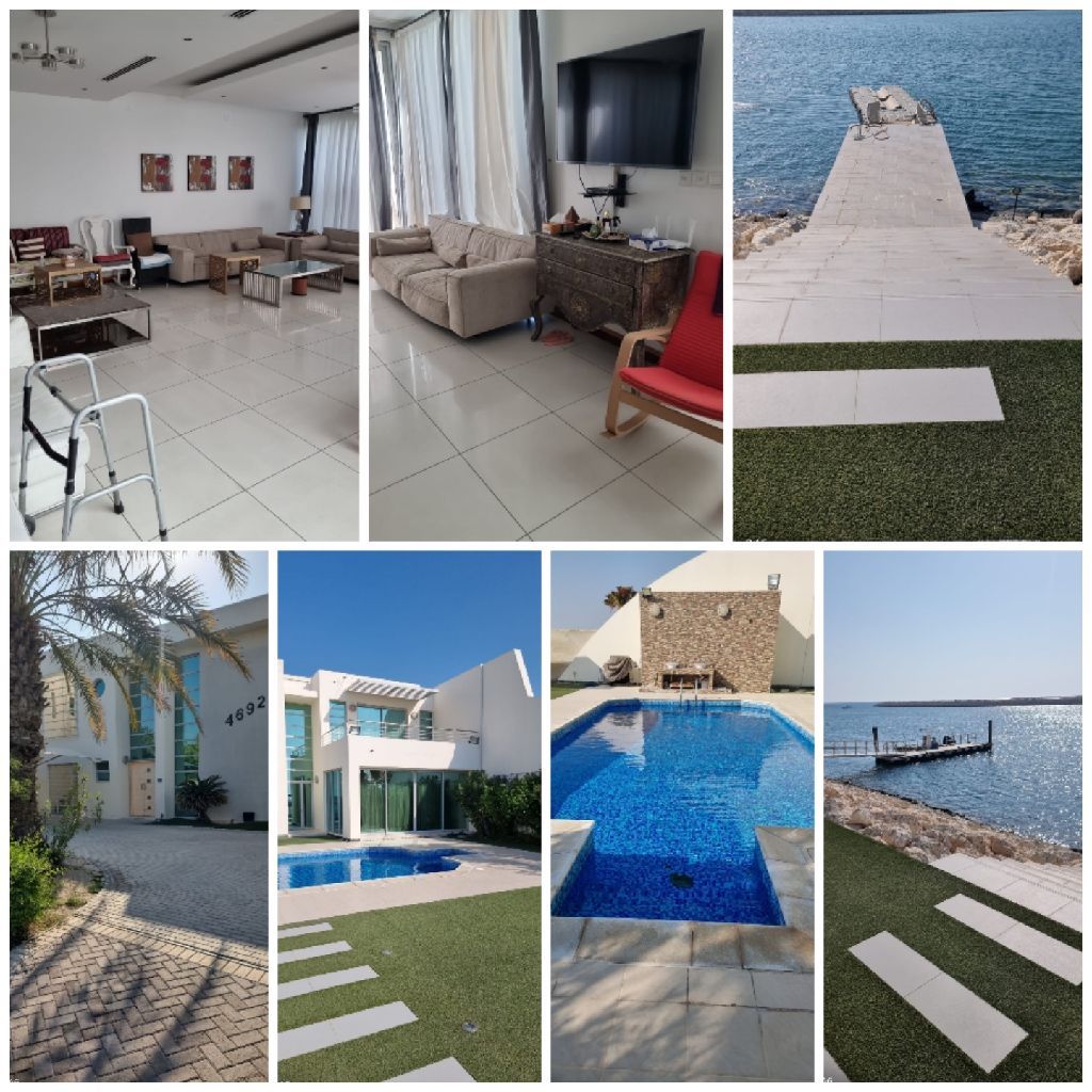 Villa 181 for sale. Location: Durrat Al Bahrain. Land area: 753 square meters. It consists of 4 bedrooms, a living room, a kitchen, 5 bathrooms, a swimming pool, and a boat dock. Unique beachfront view. Price: 300,000 dinars. For contact.