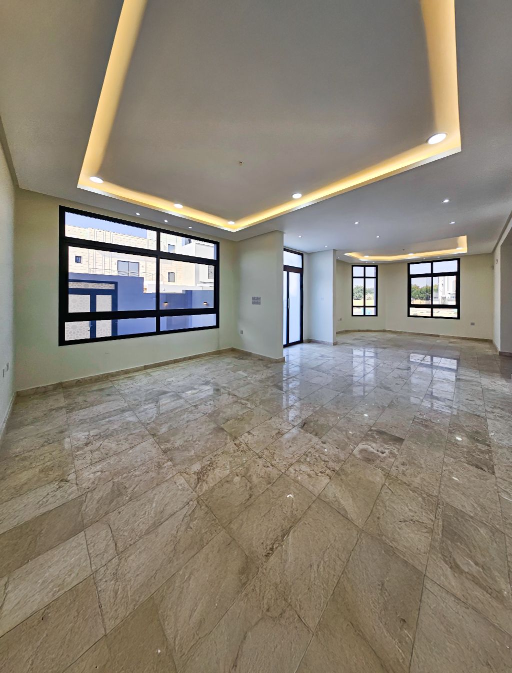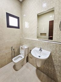 Villa for sale in Bani Jamra. The land area is 204 square meters, and the built-up area is 364 square meters. The villa is located on a corner and consists of 4 bedrooms, 5 bathrooms, two living rooms, an internal kitchen with furniture, an external kitchen, a maid's room with a private bathroom, a laundry area, a garden, two parking spaces, parquet flooring, and a marble staircase. The price is 145,000 Bahraini dinars. For inquiries, contact Abdullah Fadl via +AF-VS11251.