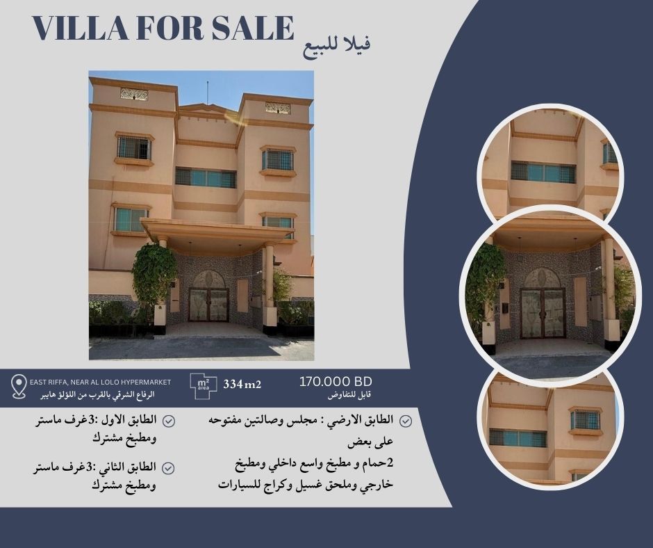 For sale An elegant villa located in East Riffa, near Lulu Hypermarket. The area is 334 SQM. The ground floor includes a Majlis, two open connected halls, two bathrooms, a spacious internal kitchen, an external kitchen, a laundry room, and a car garage. The first floor has three master bedrooms and a shared kitchen. The second floor has three master bedrooms and a shared kitchen. For contact