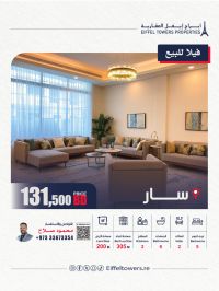 Eiffel Towers Real Estate Company offers a villa for sale in Saar. The land area is 200 square meters, and the built-up area is 305 square meters. Villa details: 5 bedrooms, 2 living rooms, 2 kitchens, 6 bathrooms, and 1 parking space. Additional features include a garden area and a dining room, located near all services. The total price is 131,500 Bahraini dinars. For contact: Mahmoud Salah.