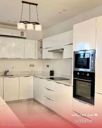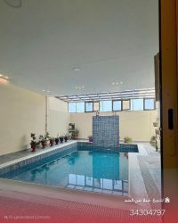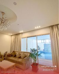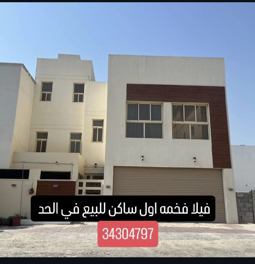 A first-occupancy villa for sale in Al-Hidd with a land area of 276 sqm. It features an external living room with a bathroom, a garage for two cars, and a fully equipped external kitchen with a dishwasher. The ground floor has two open living areas connected to each other, plus a bathroom and a fully equipped internal kitchen with built-in appliances (oven, microwave, refrigerator, freezer). There is a ready space for an electric elevator, a large stepped swimming pool with a private bathroom for the pool. The first floor has four master bedrooms (each with a bathroom) and a large living area with a private space. The second floor has a room.