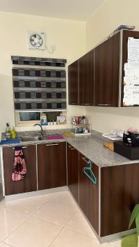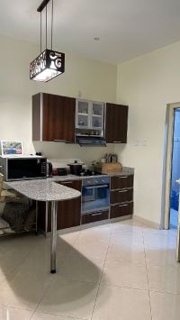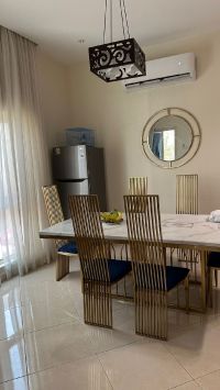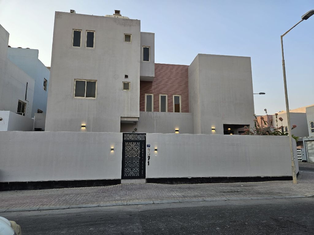 A furnished villa for sale in the Hamala area, on two streets and a corner. The land area is 190 square meters, and the built-up area is 235 square meters. The ground floor includes a hall, an internal kitchen, a bathroom, and an external kitchen. The first floor has a master bedroom with a dressing room and a bathroom, two bedrooms, and a bathroom. The second floor includes a maid's room with a bathroom and a laundry room. The price is 105,000 BHD with furniture. For contact.