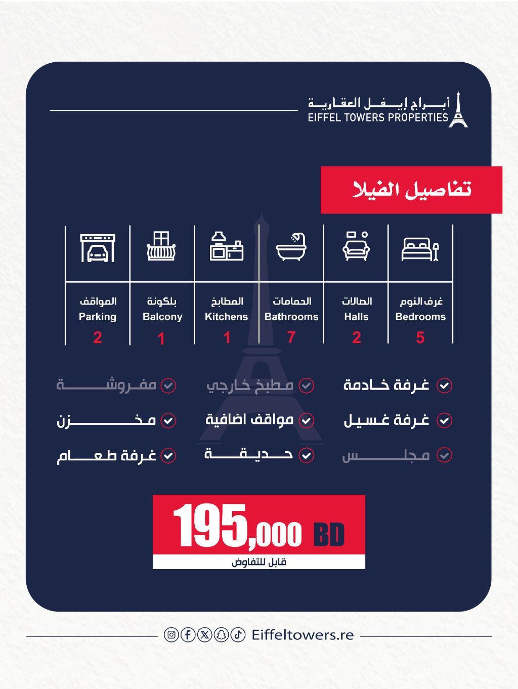 Eiffel Towers real estate Company offers a villa for sale in Saar. The land area is 306.2 SQM, and the built - up area is 405.9 SQM. Villa details 2 floors, 5 bedrooms, 2 living rooms, 1 kitchen, 2 garages, 7 bathrooms. Additional features maid's room, laundry room, dining room, two storage rooms, space for an elevator, garden. Total sale price 195000 Bahraini dinars. For contact