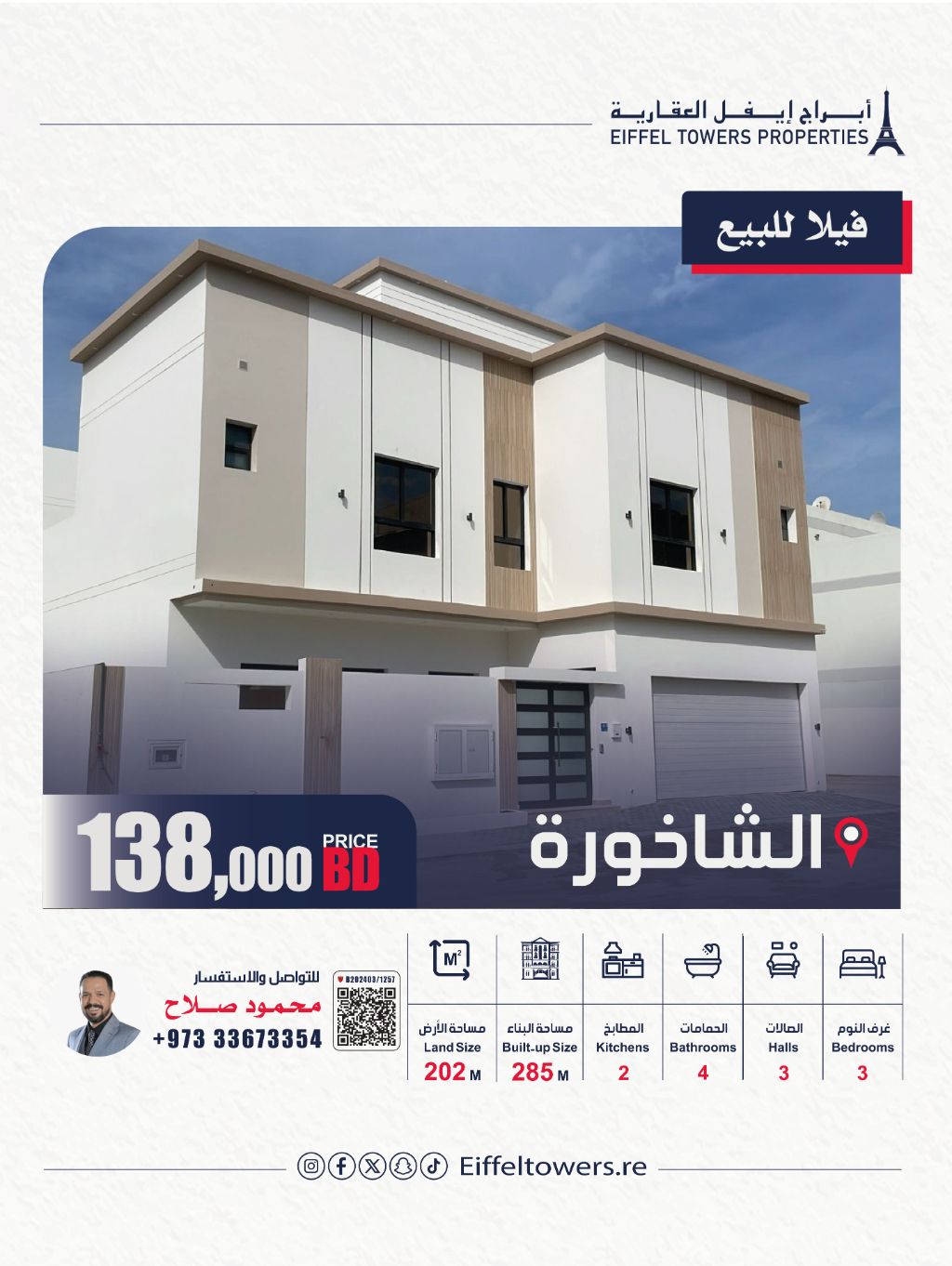 Eiffel Towers Real Estate Company offers a villa for sale in Al-Shakhura. The land area is 202 square meters, and the built-up area is 285 square meters. Villa details: 2 floors, 3 bedrooms, 3 living rooms, 2 kitchens, 2 garages, and 4 bathrooms. Additional features: all bedrooms are master bedrooms with dressing rooms, and there is a laundry room. Total price: 138,000 BHD. For contact: Mahmoud Salah.