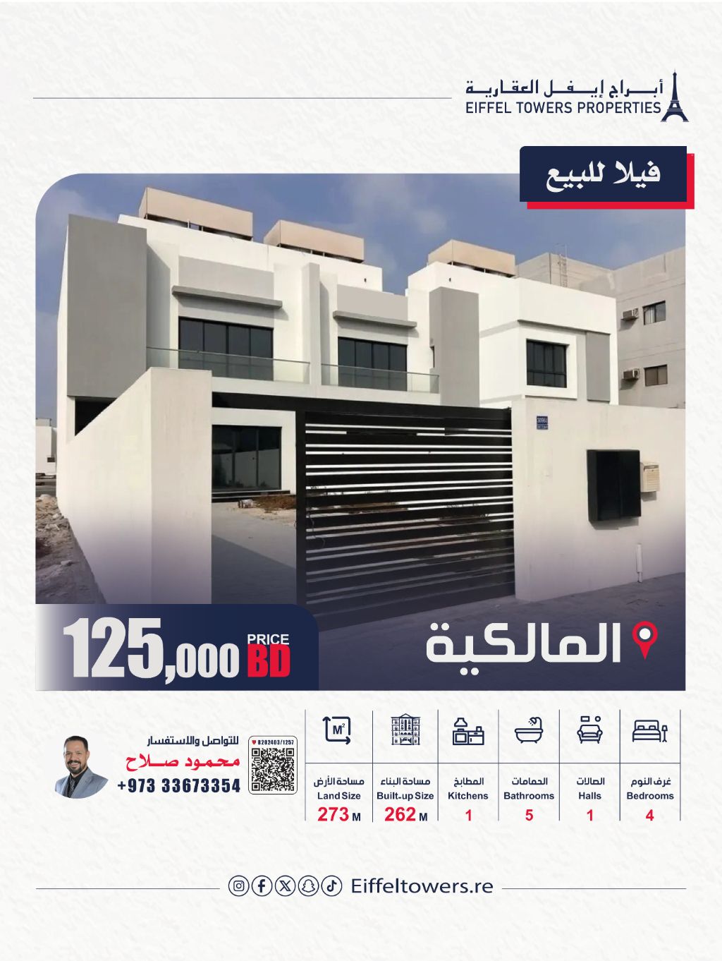Eiffel Towers Real Estate Company offers a villa for sale in Al-Malikiya. The land area is 273 square meters, and the built-up area is 262 square meters. It consists of two floors, with 4 bedrooms, 1 living room, 5 bathrooms, 1 kitchen, and 2 parking spaces. Additional features of the villa include a laundry room, a spacious garden, and a balcony. The price is 125,000 Bahraini dinars. For contact, reach out to Mahmoud Salah.