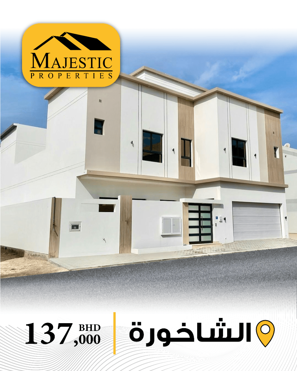 For sale, a new villa in Al-Shakhura consisting of 3 master bedrooms with dressing rooms, 3 open living areas, 2 kitchens (internal and external), 4 bathrooms, a laundry room, a garage for 2 cars, land area of 202 square meters, built-up area of 285 square meters. The asking price is 137,000 Bahraini dinars. Ref MPM2955.