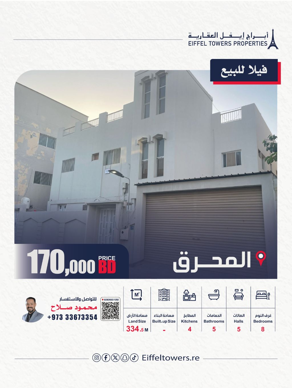 Eiffel Towers Real Estate Company offers a villa for sale in Muharraq. The land area is 334.5 square meters. Villa details: Number of floors: 2. Ground floor: 2 rooms, 2 halls, 1 kitchen, 2 garages, 2 bathrooms. First floor: Two apartments. Apartment 1: 3 rooms, 1 hall, 1 kitchen, 1 bathroom. Apartment 2: 2 rooms, 2 halls, 1 kitchen, 1 bathroom. Additionally, there is a rented annex consisting of one room and one hall.