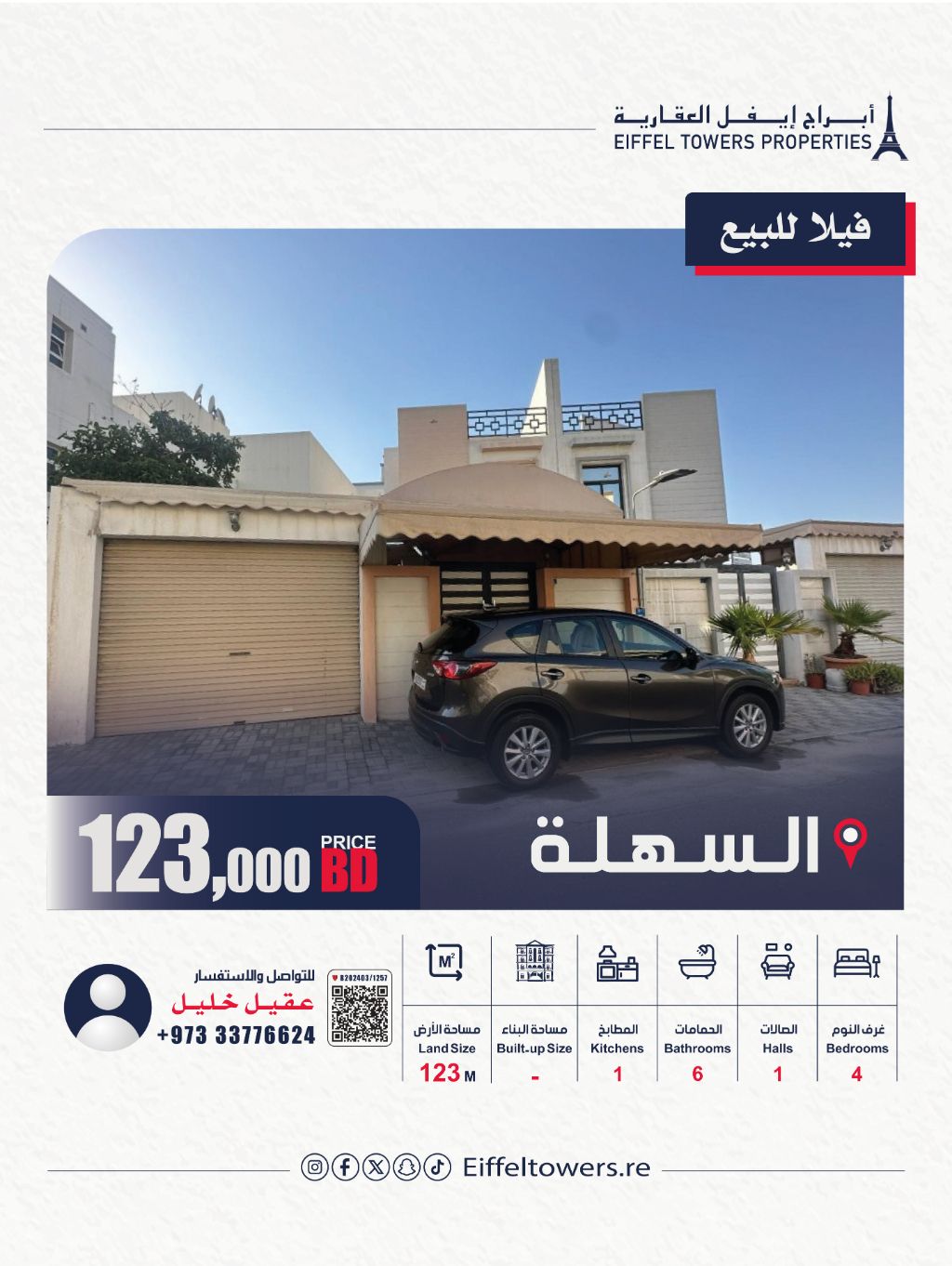 Eiffel Towers real estate Company offers a villa for sale in Al Sahla Al Shamaliya. The land area is 262.2 SQM. Villa details 3 floors, 4 bedrooms, 1 living room, 1 kitchen, 2 garages, 6 bathrooms. Additional features maid's room, laundry area, space for building an external kitchen. Total price 123000 Bahraini dinars. For contact Aqeel Khalil