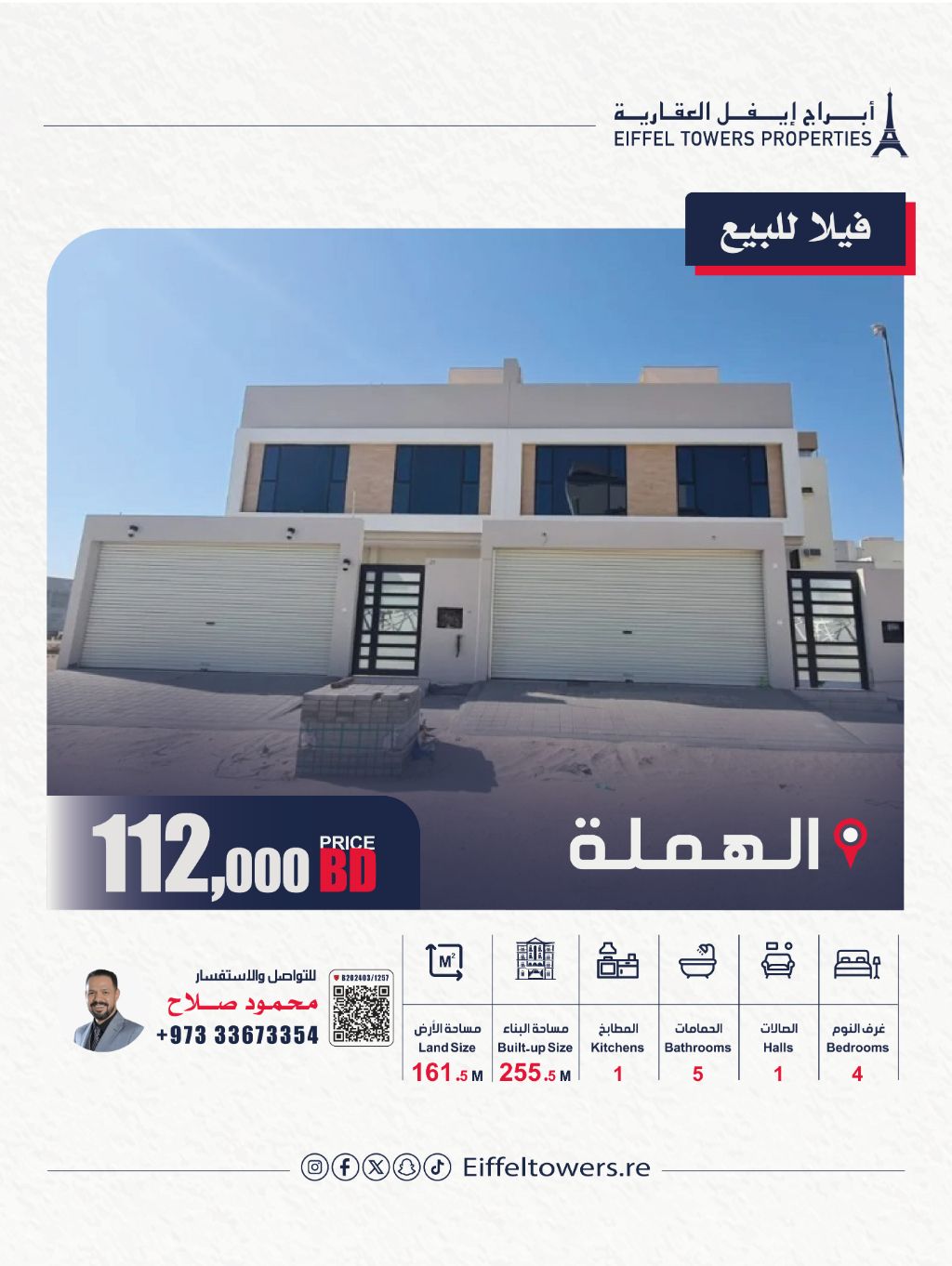 Eiffel Towers Real Estate Company offers a villa for sale in Al Hamalah. The land area is 161.5 square meters, and the built-up area is 255.5 square meters. Villa details: 2 floors, 4 bedrooms, 1 living room, 1 kitchen, 2 garages, and 5 bathrooms. The total price is 112,000 Bahraini dinars. For contact: Mahmoud Salah.