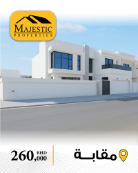 For sale: A new villa in Muqabba, near St. Christopher's School, consisting of 4 bedrooms, 2 living rooms, a kitchen, a dining room, 6 bathrooms, a maid's room, a laundry room, central air conditioning, an elevator, a garden, a garage for 2 cars. Land area: 319.6 sqm, built-up area: 388 sqm. Asking price: 260,000 Bahraini dinars, negotiable. Ref: MPM2851