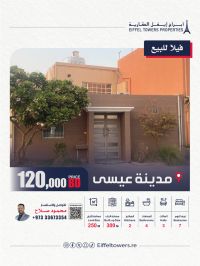 Eiffel Towers Real Estate Company offers a villa for sale in Isa Town. The land area is 250 square meters, and the built-up area is 300 square meters. Villa details: 2 floors, 7 rooms, 3 living rooms, 2 kitchens, 2 garages, and 4 bathrooms. Additional features include a courtyard and proximity to all services. The total price is 120,000 Bahraini dinars. For contact: Mahmoud Salah, eiffeltowers.re, eiffeltowers.re. Licensed broker approved by the Real Estate Regulatory Authority, license number B202403/1257.