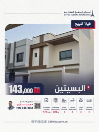 Eiffel Towers Real Estate Company offers a villa for sale in Al-Busaiteen. The land area is 174.9 square meters, and the built-up area is 300 square meters. Villa details: 3 floors, 5 bedrooms, 2 living rooms, 2 kitchens, 2 garages, and 6 bathrooms. Additional features: dining room, laundry room, space designated for elevator installation, and proximity to all services. Total price: 143,000 Bahraini dinars. For contact: Mahmoud Salah.