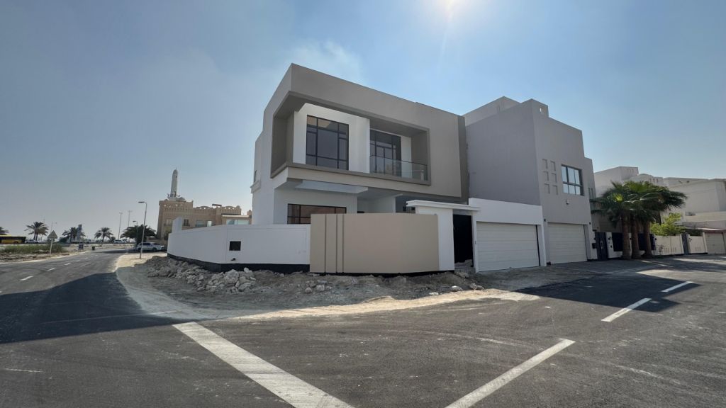 Dominions Real Estate for sale: A residential villa in the Saraya 2 (Bu Qawwa) area, on two streets and a corner. The villa consists of two floors (central air conditioning for the entire villa). The ground floor includes a spacious hall, a fully equipped internal kitchen, a fully equipped external kitchen, two guest bathrooms, a large garden, and a garage for two cars. Land area: 383 square meters. Building area: 414 square meters. Price: 250,000 dinars. Reference: 4537.