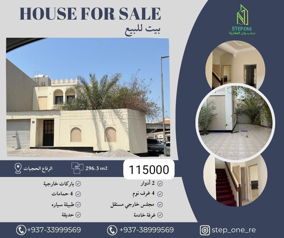 House for sale in Riffa Al Hajiyat, corner location, two floors, area 296.3 sqm, quiet location and close to services. Ground floor: one bedroom, separate majlis with bathroom, hall, two kitchens (internal and external), maid's room with bathroom. Spacious yard with car garage. First floor: three bedrooms, hall, two bathrooms. Price 115,000 Bahraini dinars. Negotiable. The house is currently rented for 470 dinars. Contact.