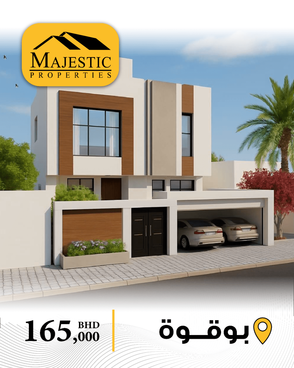 For sale: a new villa in Bu Quwah - Saraya 2, consisting of 4 bedrooms, 2 living rooms, a kitchen, 5 bathrooms, a maid's room, a laundry room, a garden, a garage for two cars. Land area is 250 square meters, building area is 353 square meters. The asking price is 165,000 Bahraini dinars. Ref: MPM3239.