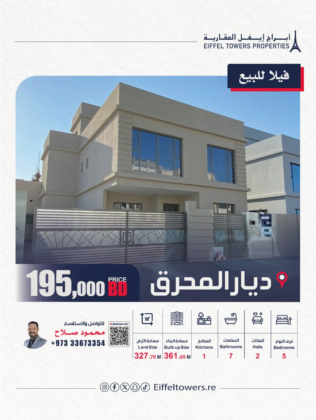 Eiffel Towers Real Estate Company offers a villa for sale in Diyar Al Muharraq (Muzon). The land area is 327.70 square meters, and the built-up area is 361.05 square meters. Villa details: 3 floors, 5 bedrooms, 2 living rooms, 1 kitchen, 2 garages, and 7 bathrooms. Additional features include a majlis, laundry room, maid's room, and central air conditioning. The total price is 195,000 Bahraini dinars. For contact: Mahmoud Salah, eiffeltowers-re, eiffeltowers.re, certified broker by the Real Estate Regulatory Authority.
