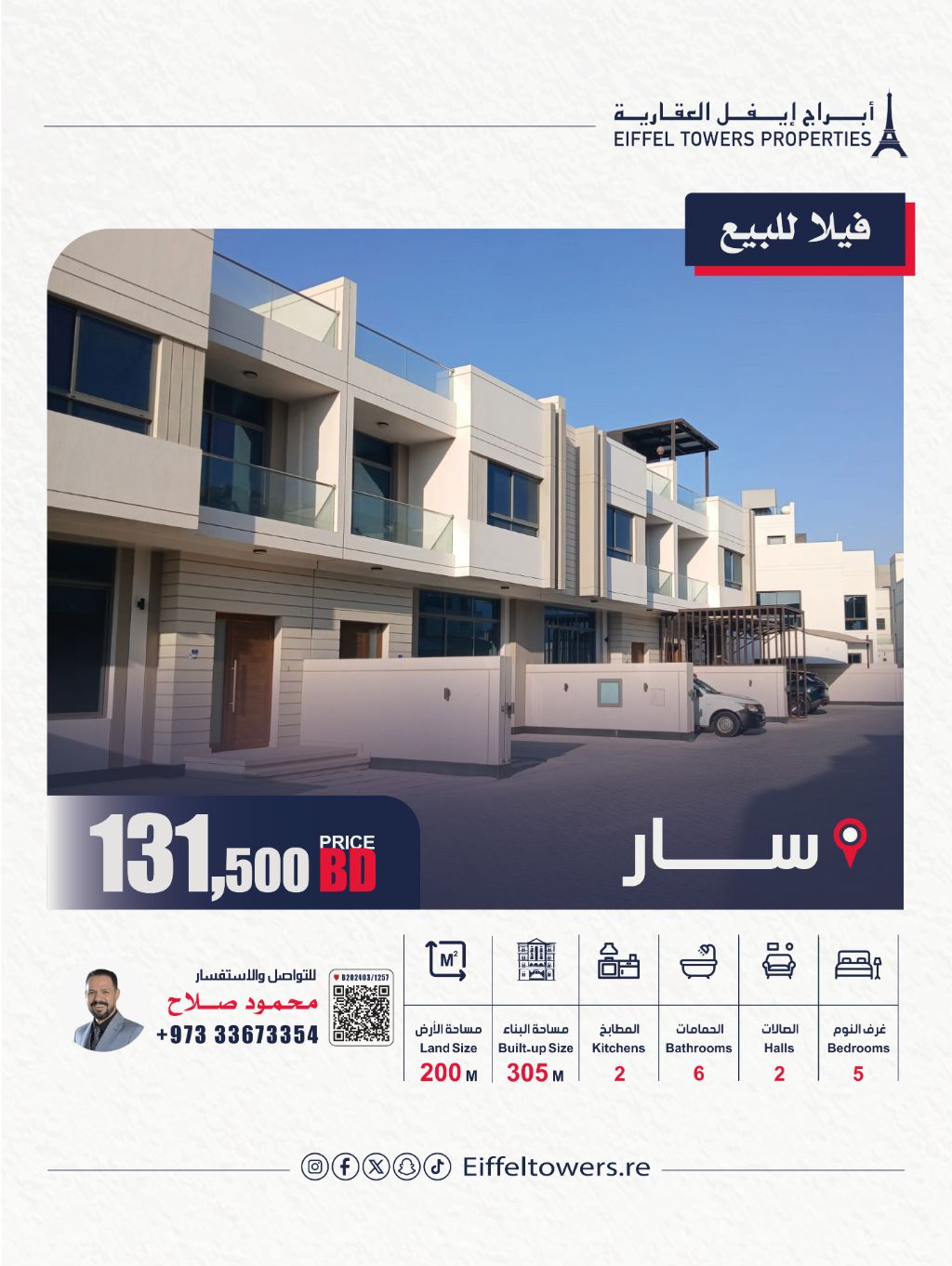 Eiffel Towers Real Estate Company offers a villa for sale in Saar. The land area is 200 square meters, and the built-up area is 305 square meters. Villa details: 5 bedrooms, 2 living rooms, 2 kitchens, 6 bathrooms, and 1 parking space. Additional features include a garden area and a dining room, located near all services. The total price is 131,500 Bahraini dinars. For contact: Mahmoud Salah, eiffeltowers.re, eiffeltowers.re. Certified broker by the Real Estate Regulatory Authority, license number B202403/1257.
