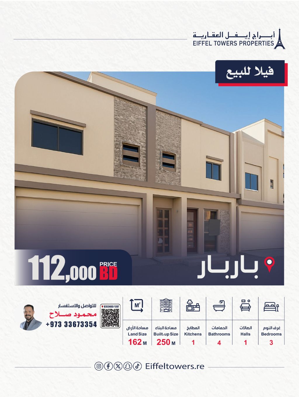 Eiffel Towers Real Estate Company offers a villa for sale in Barbar. The land area is 162 square meters, and the built-up area is 250 square meters. Villa details: 3 bedrooms, 1 living room, 1 kitchen, 4 bathrooms, and 2 parking spaces. The total price is 112,000 Bahraini dinars. For contact: Mahmoud Salah, eiffeltowers-re, eiffeltowers.re. Licensed broker approved by the Real Estate Regulatory Authority, license number B202403/1257.