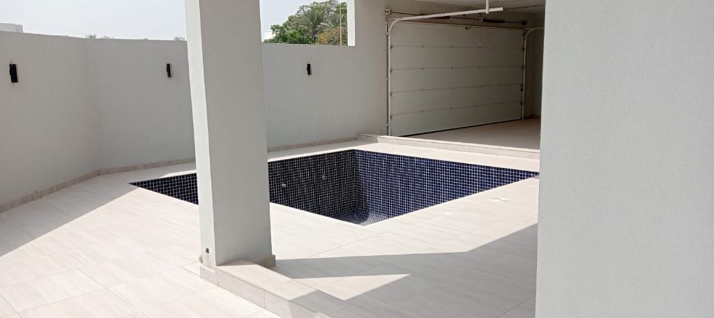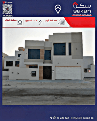 Luxury villas in a prime location with ground floor amenities: a family living area, an open kitchen and dining area, a closed kitchen, 2 bathrooms, and 2 laundry sinks. Features include a swimming pool and outdoor seating, a garage for 2 cars, and a garden. Elevator access with 3 parking spaces. First floor amenities: a master bedroom, 3 attached bedrooms, a living room, a coffee corner, a hallway, and elevator access. Upper floor amenities: a well-arranged attached bedroom, a laundry room, a storage room, elevator access, and a hallway. Land area is 304 square meters. Villa price is 260,000 BHD, negotiable.