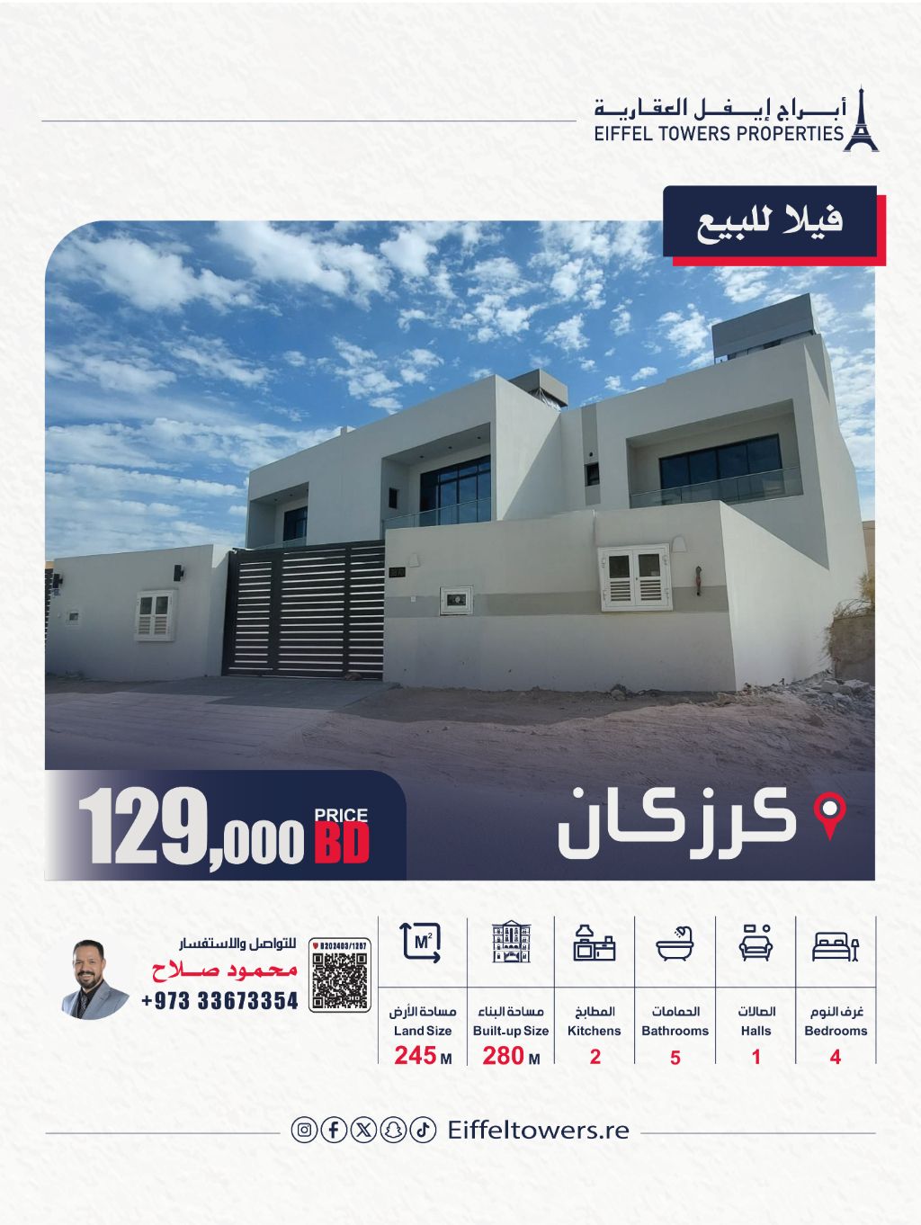 Eiffel Towers Real Estate Company offers a villa for sale in Karzakan (Al Hasan District). The land area is 245 square meters, and the built-up area is 280 square meters. Villa details: 4 bedrooms, 1 living room, 2 kitchens, 5 bathrooms, and 2 parking spaces. Additional features: dining area, spacious front garden, and a changing room with a balcony. Total price: 139,000 Bahraini dinars. For contact: Mahmoud Salah, eiffeltowers-re, eiffeltowers.re, certified broker by the institution.
