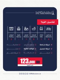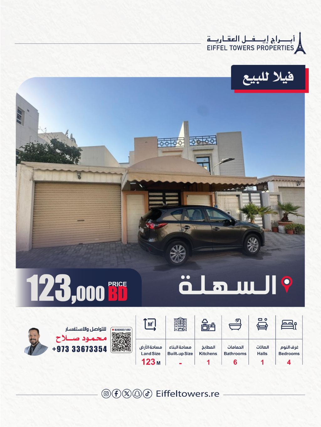 Eiffel Towers Real Estate Company offers a villa for sale in Al Sahla Al Shamaliya. The land area is 262.2 square meters. Villa details: 3 floors, 4 bedrooms, 1 living room, 1 kitchen, 2 garages, 6 bathrooms. Additional features: maid's room, laundry area, space for building an external kitchen. Total price: 123,000 Bahraini dinars. For contact: Mahmoud Salah, eiffeltowers-re, eiffeltowers.re. Certified broker by the Real Estate Regulatory Authority, license number B202403/1257.
