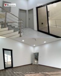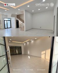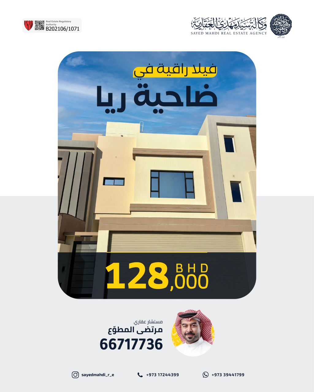 For sale: A luxurious villa in Riffa Views - Durrat Al Bahrain. Land area: 176 sqm. Built-up area: 260 sqm. Two and a half floors. The ground floor includes a two-car garage, two living rooms, an open kitchen plus a kitchen, a backyard garden, and a guest bathroom. The first floor contains three bedrooms with three bathrooms. The roof is prepared for a barbecue and relaxation area. The second floor includes a maid's room with a bathroom. The villa features high-quality construction specifications, luxury ceramic tiles, and natural lighting.