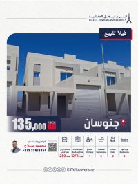 Eiffel Towers Real Estate Company offers a villa for sale in Janusan. The land area is 358.3 square meters, and the built-up area is 250 square meters. Villa details: 3 floors, 4 bedrooms, 2 living rooms, 1 kitchen, 2 garages, and 5 bathrooms. Additional features include a backyard, sea view, comprehensive services, and paved streets. The total price is 135,000 Bahraini dinars. For contact: Mahmoud Salah, eiffeltowers.re, a certified broker by the Real Estate Regulatory Authority.