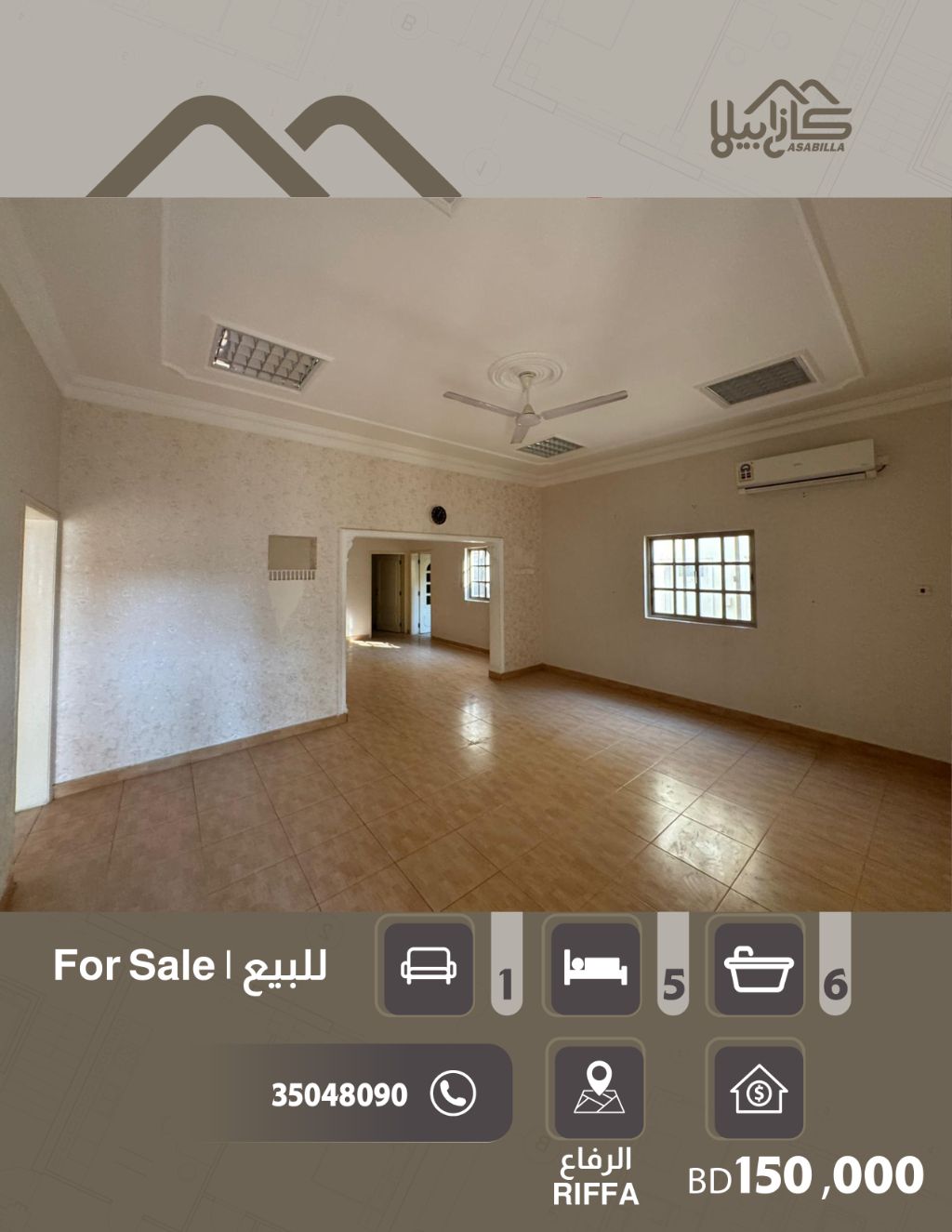 For sale: A house in the Riffa area - prime location. First, house details: 4 bedrooms (two of them master bedrooms), a separate majlis with a bathroom, 6 bathrooms, two living rooms, a kitchen + external annex, a maid's room, two storage rooms. Second, facilities and services: 3 covered parking spaces, air conditioning fully available, prime location close to all services (schools, mosque, Lulu), a quiet and upscale area, equipped with surveillance cameras. Third, area and price: Area 371 square meters, price 150,000.