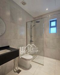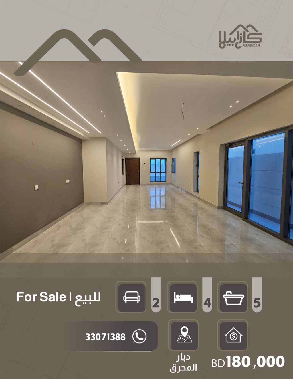 For sale: A two-and-a-half-story villa with freehold ownership for all nationalities in a prime location in Diyar Al Muharraq, with an installment plan for 10 years. First, the villa details: The ground floor contains 1 spacious family living room, 2 kitchens (internal and external), 1 master bedroom, 1 bathroom serving the living room, a backyard garden, a front yard, and parking for two cars. The first floor contains 3 bedrooms, including two master bedrooms, 3 bathrooms, and 1 living room. The second floor contains a maid's room with a bathroom and a laundry area.