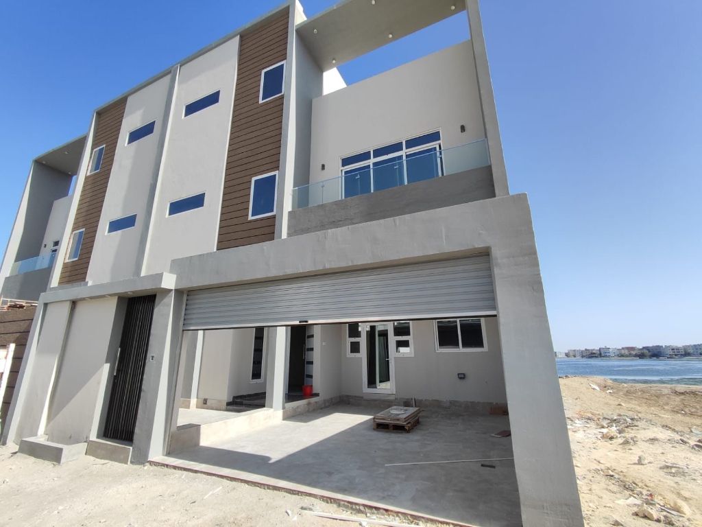 For sale: a modern residential villa in Tubli with a sea view. Land area: 232 square meters. Building area: 367.5 square meters. The villa consists of two living rooms, 3 bedrooms, 4 bathrooms, 3 balconies, a dining room, an open kitchen, a closed kitchen, a maid's room, a front garden, a back garden, and a garage for two cars. Price: 168,000 dinars.