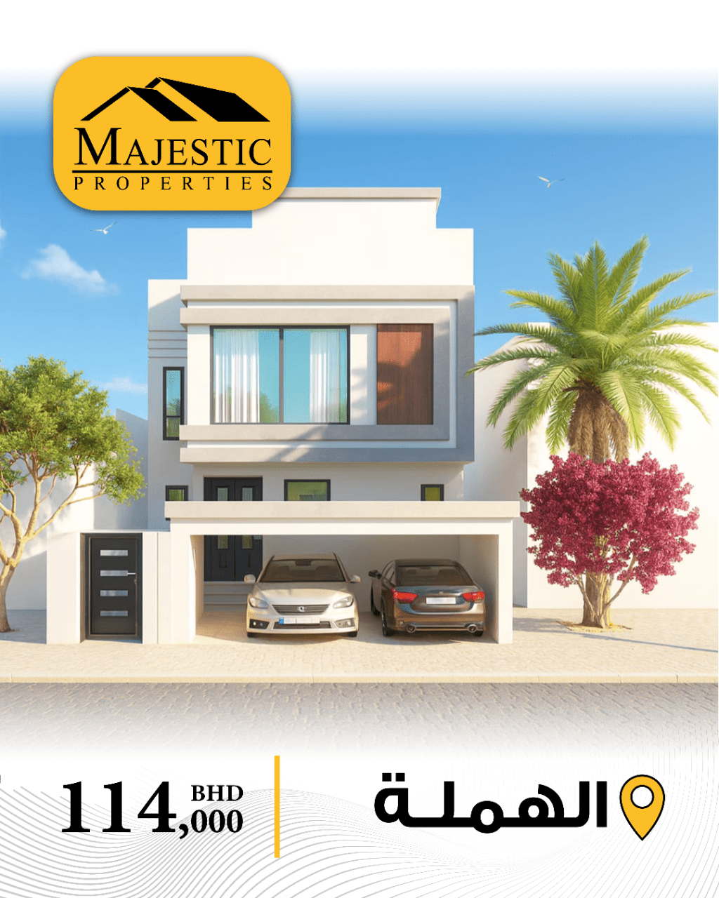 For sale, a new house in Al Hamala consisting of 5 bedrooms, a spacious living room, kitchen, dining room, 6 bathrooms, laundry room, storage room, a room dedicated for an elevator, garage for two cars. Land area: 161 square meters. Building area: 250 square meters. Asking price: 114,000 Bahraini dinars, negotiable. Ref MPM3305.