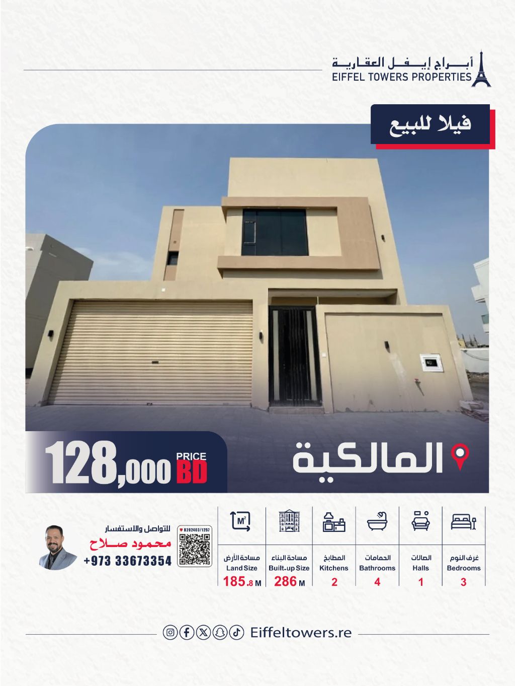 Eiffel Towers Real Estate Company for sale: A house in Al-Malikiyyah with a land area of 185.8 sqm and a built-up area of 280 sqm. Details of the villa: two floors, 3 bedrooms, 1 living room, 2 kitchens, 4 bathrooms, and 2 parking spaces. Additional features: a majlis with the living room, close to all services. Total price: 128,000 Bahraini dinars. For contact: Mahmoud Salah, eiffeltowers.re, eiffeltowers.re, a broker certified by the Real Estate Regulatory Authority, license number B202403/1257.
