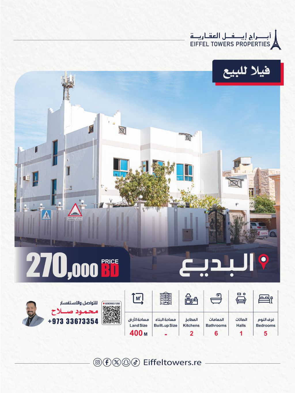 Eiffel Towers Real Estate Company for sale: A house in Al-Budaiya with a land area of 400m. Details of the villa: two floors, 5 bedrooms, 1 living room, 2 kitchens, 6 bathrooms, 2 parking spaces. Additional features: a majlis, a large courtyard, close to all services, a dining room. Total price: 270,000 Bahraini dinars. For contact: Mahmoud Salah, eiffeltowers.re, eiffeltowers.re, a broker licensed by the Real Estate Regulatory Authority, license number B202403/1257.
