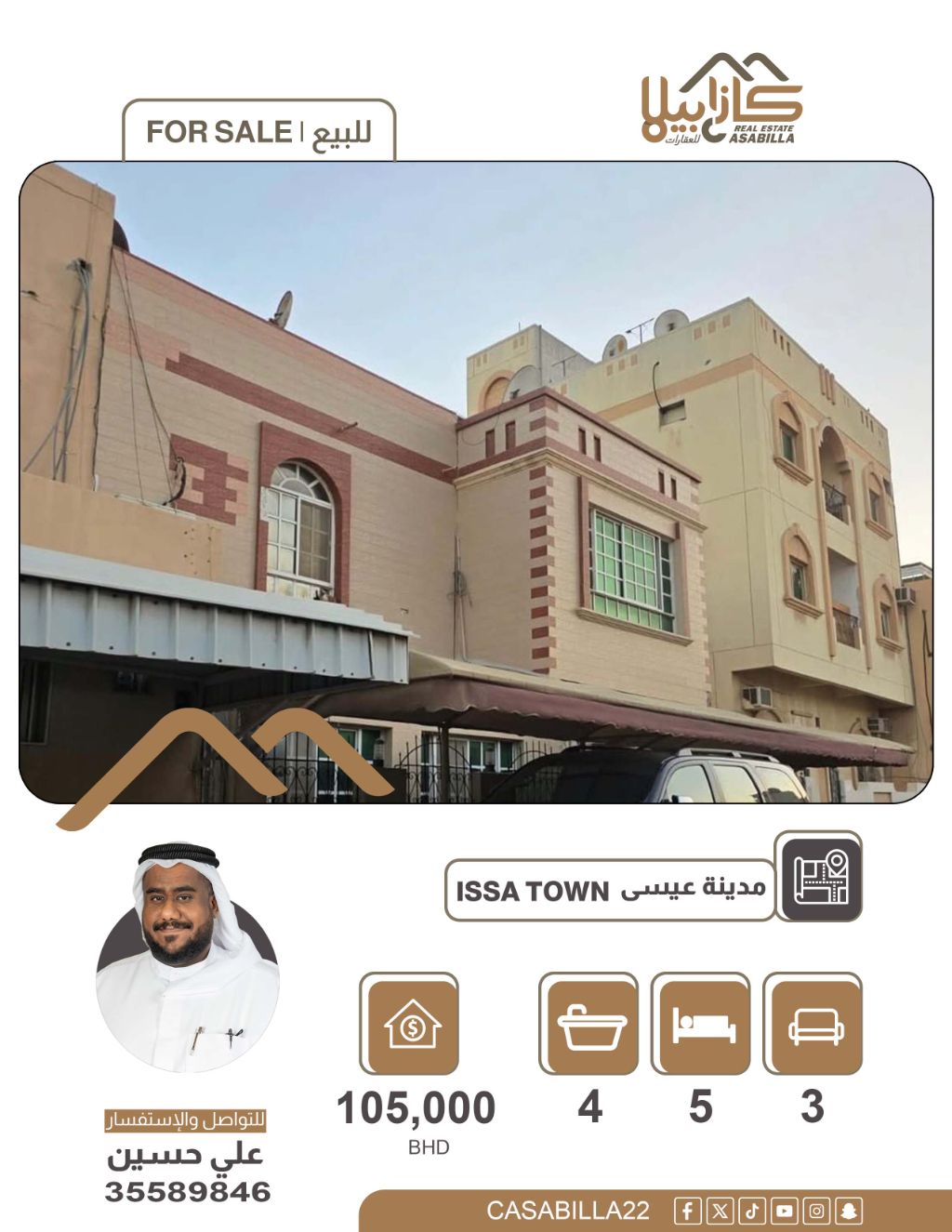 For sale: A house in Isa Town, near Khalifa Sports City. Land area: 154 sqm. The house consists of two floors. Ground floor: living room, master bedroom, dining area, laundry room, bathroom serving the living area, kitchen. First floor: 3 bedrooms (2 master), small living area, preparation kitchen. Sale price: 105,000 Bahraini dinars, negotiable within reason. For serious buyers only - a great opportunity for living or investment. For contact and inquiries.