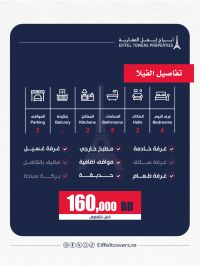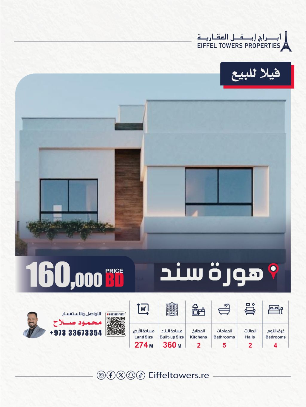 Eiffel Towers Real Estate Company offers a villa for sale in Hoora, with a land area of 274 sqm and a built-up area of 360 sqm. Villa details include 2 floors, 4 bedrooms, 2 living rooms, 2 kitchens, 2 garages, and 5 bathrooms. Additional features: laundry room, dining room, garden, and elevator. It is distinguished by its prime location. Total price: 160,000 Bahraini dinars. For contact: Mahmoud Salah, eiffeltowers.re, a broker certified by the Real Estate Regulatory Authority.